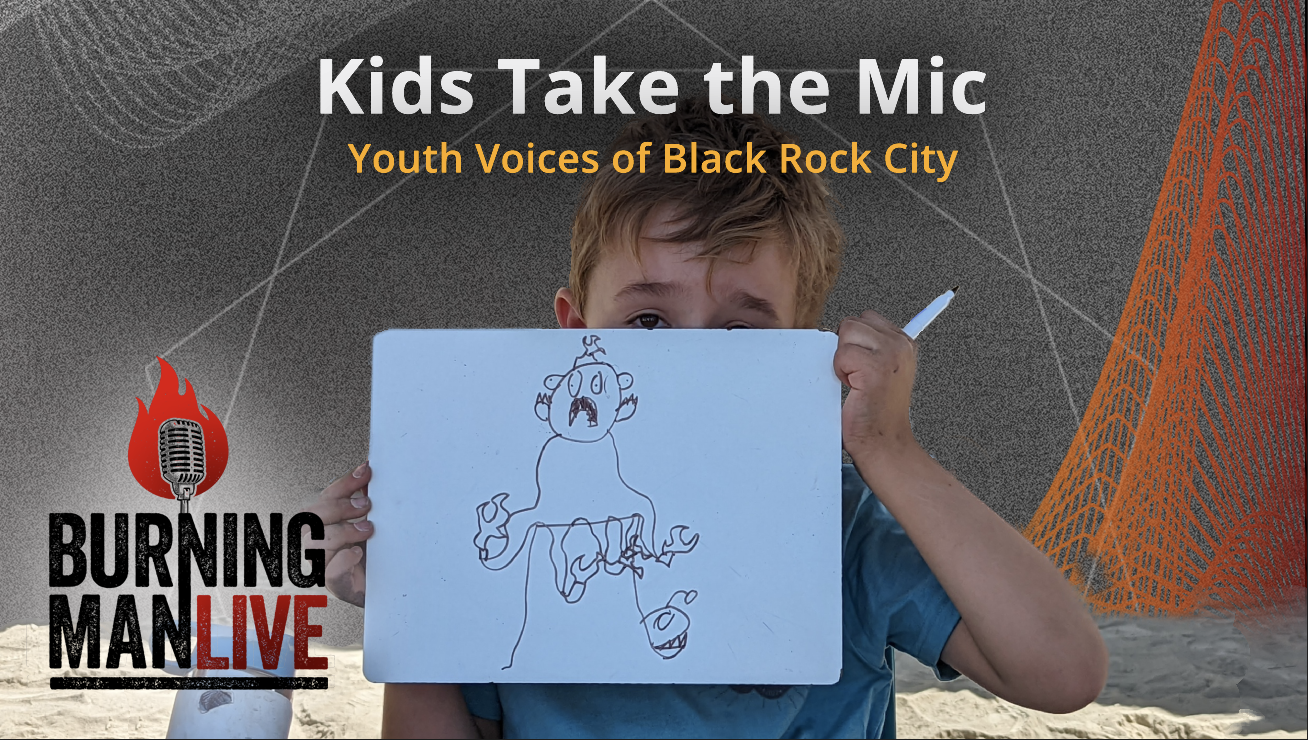 This episode is not interviews of kids; it’s mainly interviews by kids and kids telling us what’s on their minds. These kids have been participating in Black Rock City for pretty much every year of their lives. I started bringing my kid to Black Rock City back in 1995, and she’s come back every year since except two. She did have to start college. Now she’s a manager on staff, and her partner is too.
